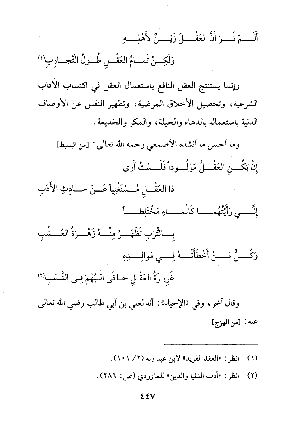 ألَمْ تَرَ أَنَّ العَقْلَ زَيْنٌ لأَهْلِه ... وَلَكِنْ تَمامُ العَقْلِ طُولُ التَّجارِبِ (¬1)