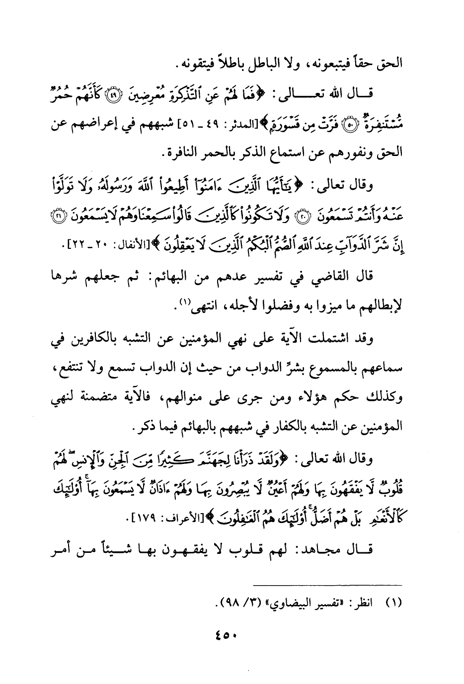 قال القاضي في تفسير عدهم من البهائم: ثم جعلهم شرها لإبطالهم ما ميزوا به وفضلوا لأجله، انتهى (¬1).