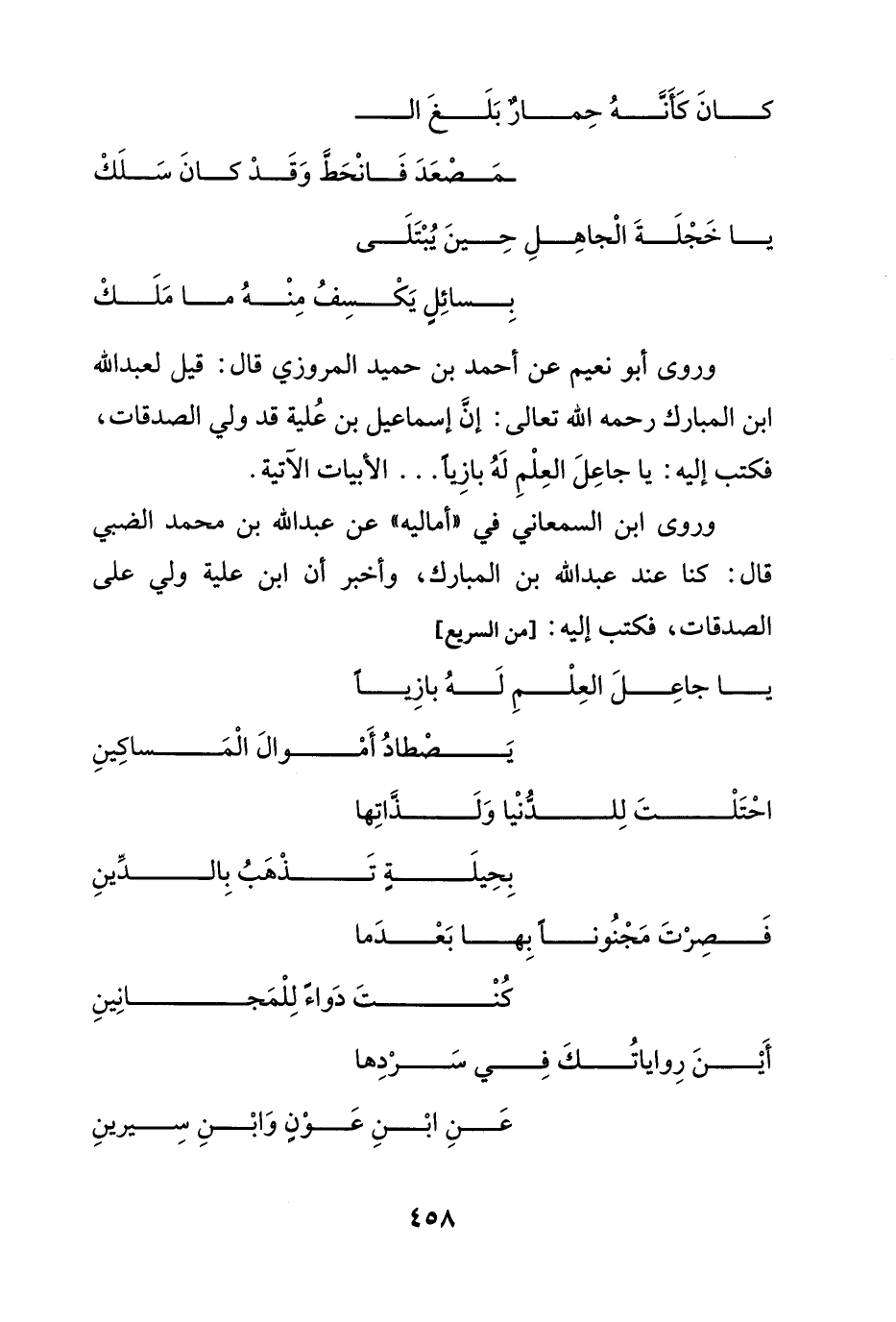 وروى ابن السمعاني في "أماليه" عن عبد الله بن محمد الضبي قال: كنا عند عبد الله بن المبارك، وأخبر أن ابن علية ولي على الصدقات، فكتب إليه: [من السريع]