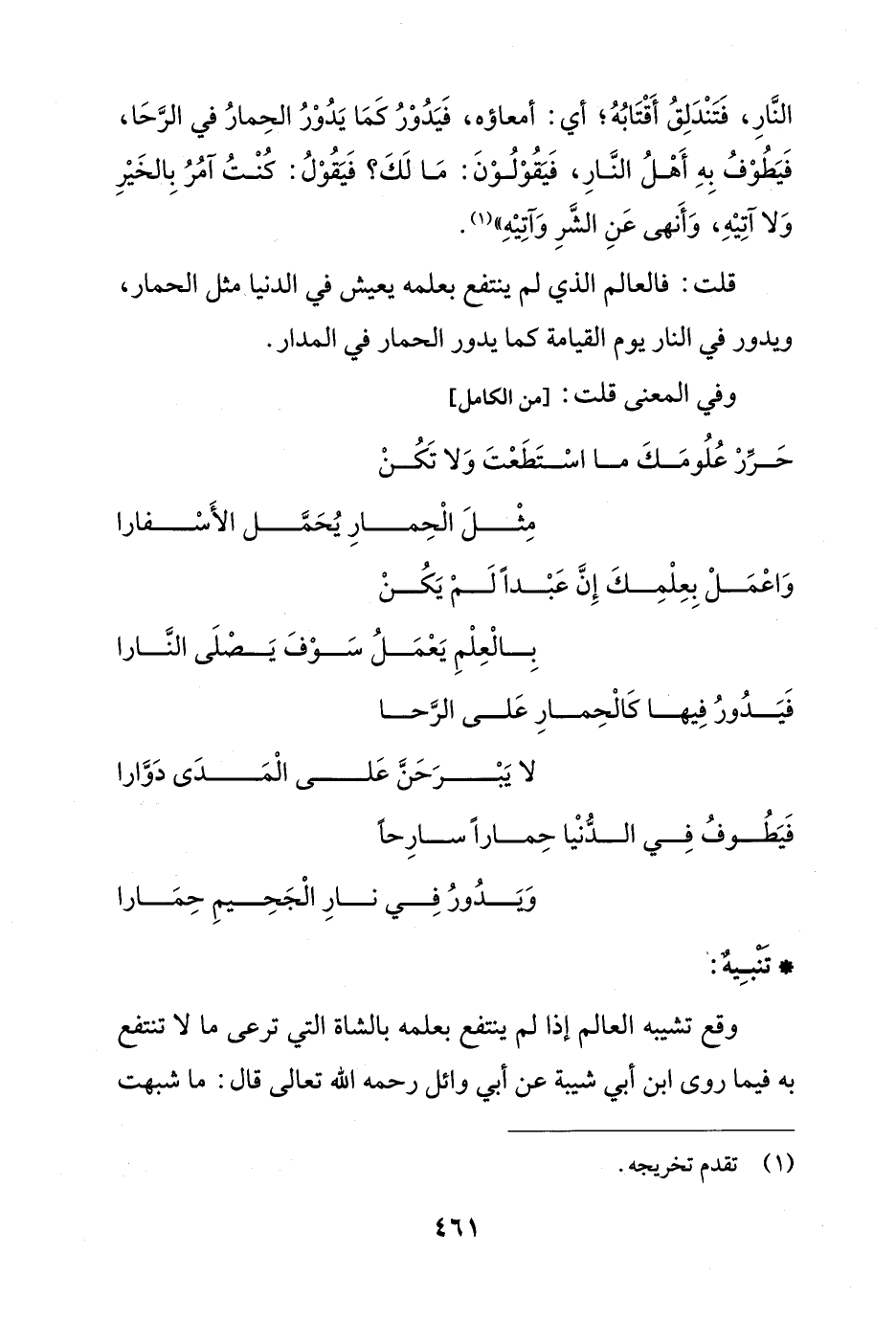 قلت: فالعالم الذي لم ينتفع بعلمه يعيش في الدنيا مثل الحمار، ويدور في النار يوم القيامة كما يدور الحمار في المدار.