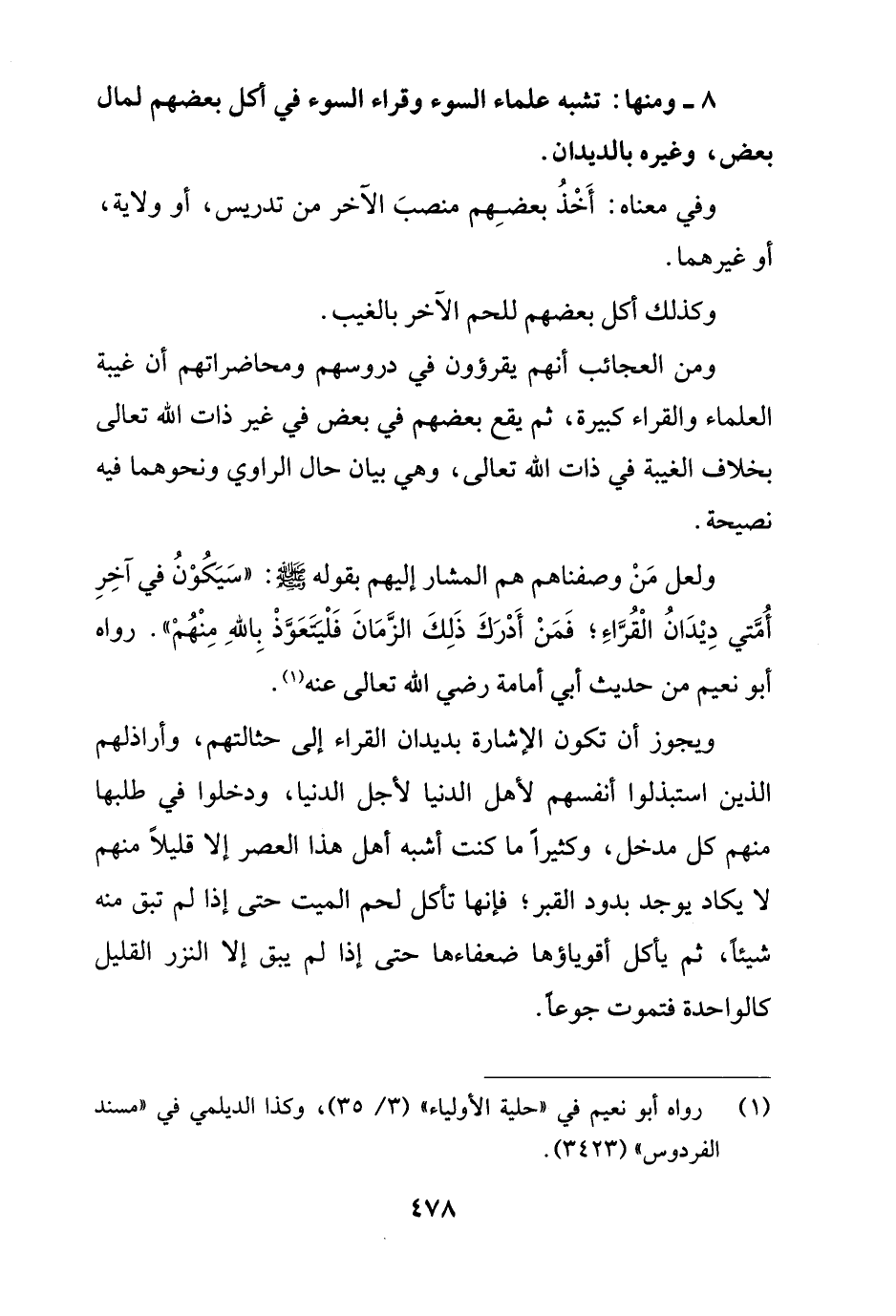 ولعل مَنْ وصفناهم هم المشار إليهم بقوله - صلى الله عليه وسلم -: "سَيَكُوْنُ في آخِرِ أُمَّتي دِيْدَانُ الْقُرَّاءِ؛ فَمَنْ أَدْرَكَ ذَلِكَ الزَّمَانَ فَلْيتَعَوَّذْ بِاللهِ مِنْهُمْ". رواه أبو نعيم من حديث أبي أمامة رضي الله تعالى عنه (¬1).