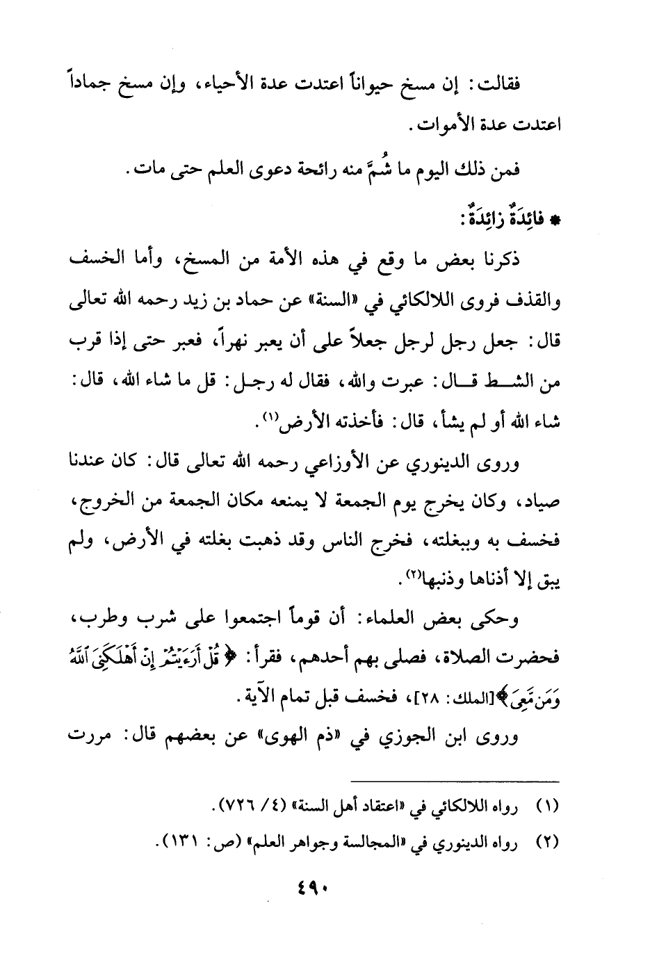 ذكرنا بعض ما وقع في هذه الأمة من المسخ، وأما الخسف والقذف فروى اللالكائي في "السنة" عن حماد بن زيد رحمه الله تعالى قال: جعل رجل لرجل جعلاً على أن يعبر نهراً، فعبر حتى إذا قرب من الشط قال: عبرت والله، فقال له رجل: قل ما شاء الله، قال: شاء الله أو لم يشأ، قال: فأخذته الأرض (¬1).
