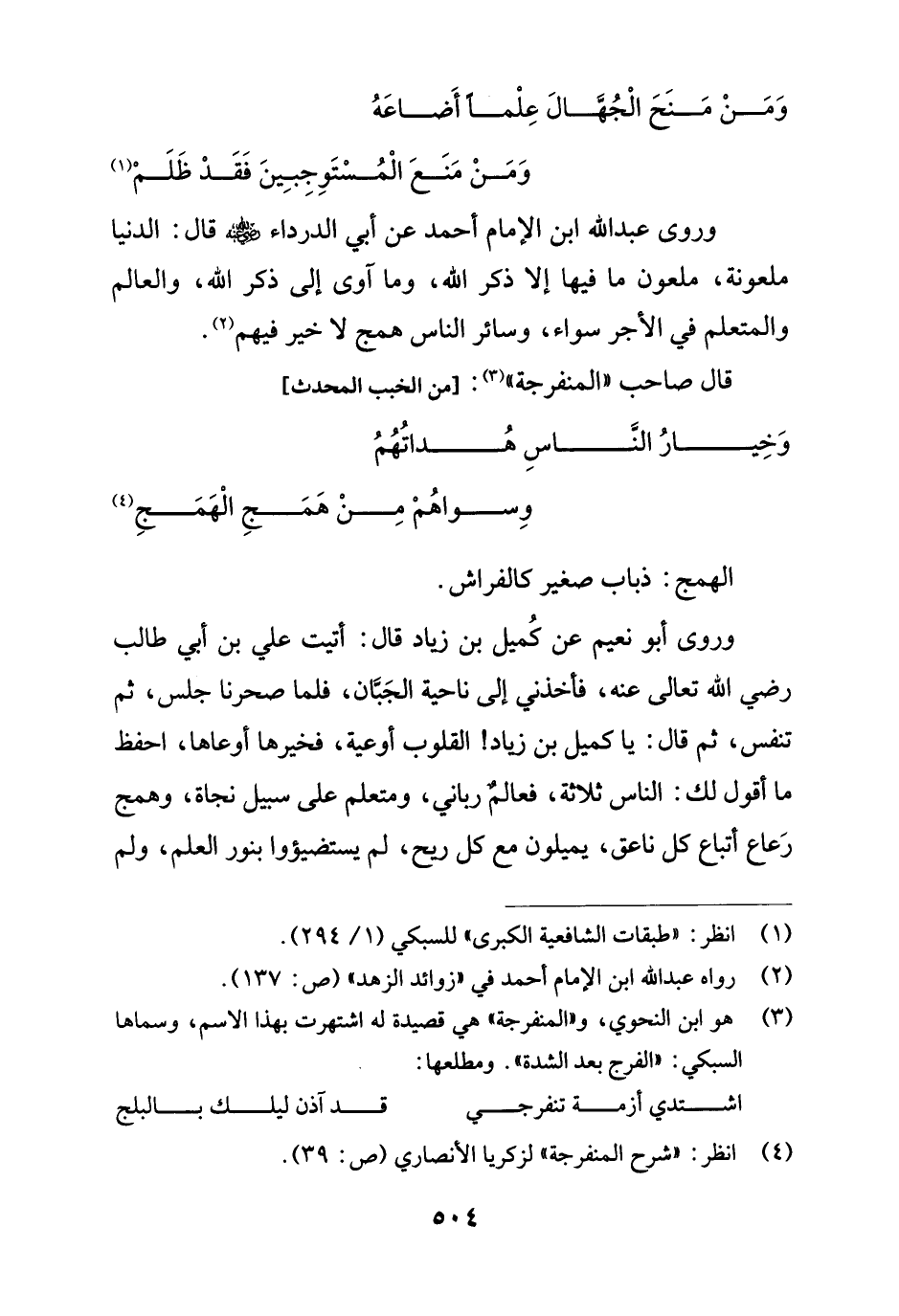 وروى أبو نعيم عن كُميل بن زياد قال: أتيت علي بن أبي طالب رضي الله تعالى عنه، فأخذني إلى ناحية الجَبَّان، فلما صحرنا جلس، ثم تنفس، ثم قال: يا كميل بن زياد! القلوب أوعية، فخيرها أوعاها، احفظ ما أقول لك: الناس ثلاثة، فعالمٌ رباني، ومتعلم على سبيل نجاة، وهمج رَعاع أتباع كل ناعق، يميلون مع كل ريح، لم يستضيؤوا بنور العلم، ولم