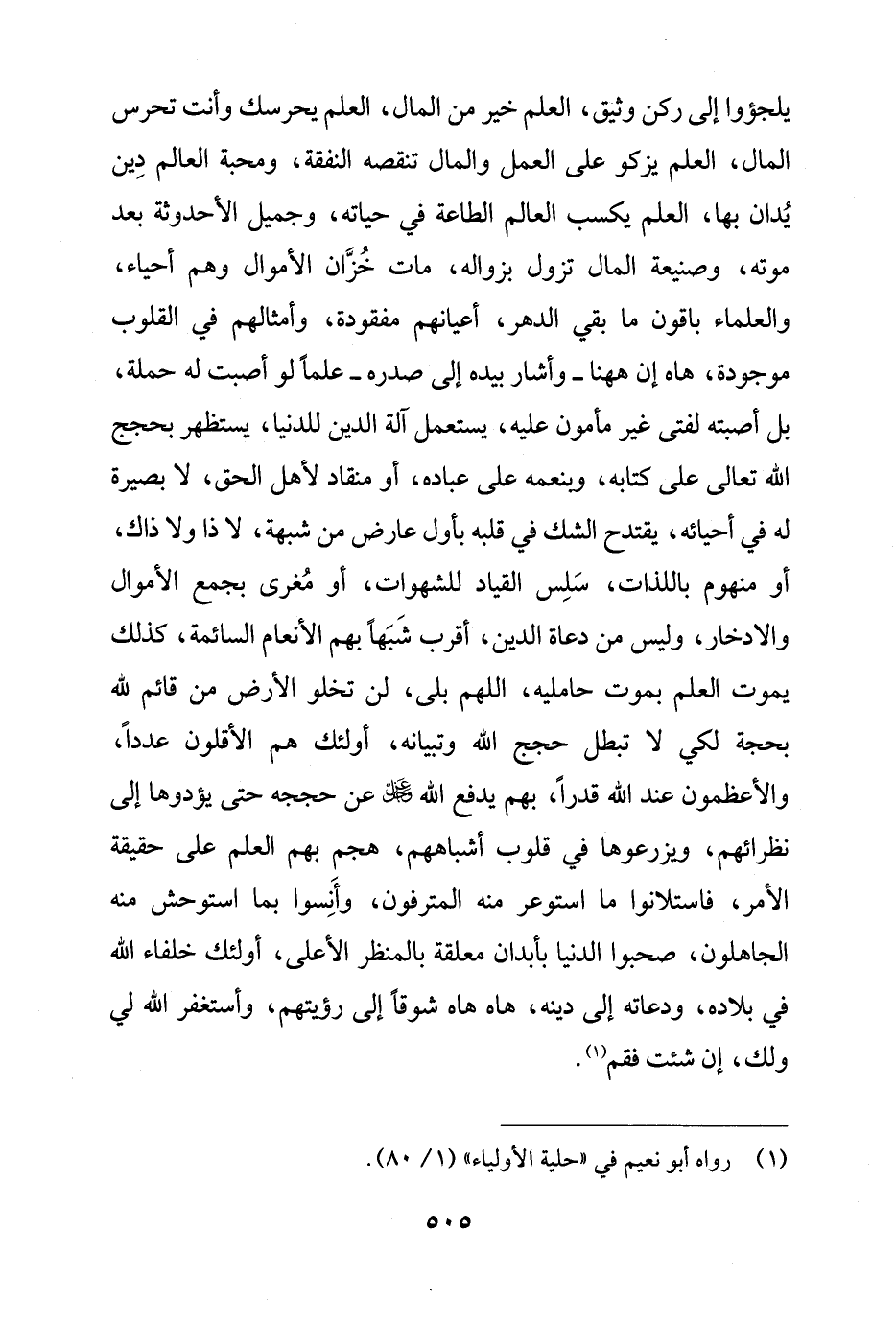 يلجؤوا إلى ركن وثيق، العلم خير من المال، العلم يحرسك وأنت تحرس المال، العلم يزكو على العمل والمال تنقصه النفقة، ومحبة العالم دِين يُدان بها، العلم يكسب العالم الطاعة في حياته، وجميل الأحدوثة بعد موته، وصنيعة المال تزول بزواله، مات خُزَّان الأموال وهم أحياء، والعلماء باقون ما بقي الدهر، أعيانهم مفقودة، وأمثالهم في القلوب موجودة، هاه إن هاهنا - وأشار بيده إلى صدره - علماً لو أصبت له حملة، بل أصبته لفتى غير مأمون عليه، يستعمل آلة الدين للدنيا، يستظهر بحجج الله تعالى على كتابه، وينعمه على عباده، أو منقاد لأهل الحق، لا بصيرة له في أحيائه، يقتدح الشك في قلبه بأول عارض من شبهة، لا ذا ولا ذاك، أو منهوم باللذات، سَلِس القياد للشهوات، أو مُغرى بجمع الأموال والادخار، وليس من دعاة الدين، أقرب شَبَهاً بهم الأنعام السائمة، كذلك يموت العلم بموت حامليه، اللهم بلى، لن تخلو الأرض من قائم لله بحجة لكي لا تبطل حجج الله وتبيانه، أولئك هم الأقلون عدداً، والأعظمون عند الله قدراً، بهم يدفع الله - عز وجل - عن حججه حتى يؤدوها إلى نظرائهم، ويزرعوها في قلوب أشباههم، هجم بهم العلم على حقيقة الأمر، فاستلانوا ما استوعر منه المترفون، وأَنِسوا بما استوحش منه الجاهلون، صحبوا الدنيا بأبدان معلقة بالمنظر الأعلى، أولئك خلفاء الله في بلاده، ودعاته إلى دينه، هاه هاه شوقاً إلى رؤيتهم، وأستغفر الله لي ولك، إن شئت فقم (¬1).