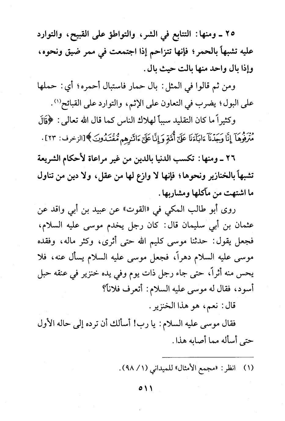 25 - ومنها: التتابع في الشر، والتواطؤ على القبيح، والتوارد عليه تشبهاً بالحمرة فإنها تتزاحم إذا اجتمعت في ممر ضيق ونحوه، وإذا بال واحد منها بالت حيث بال.