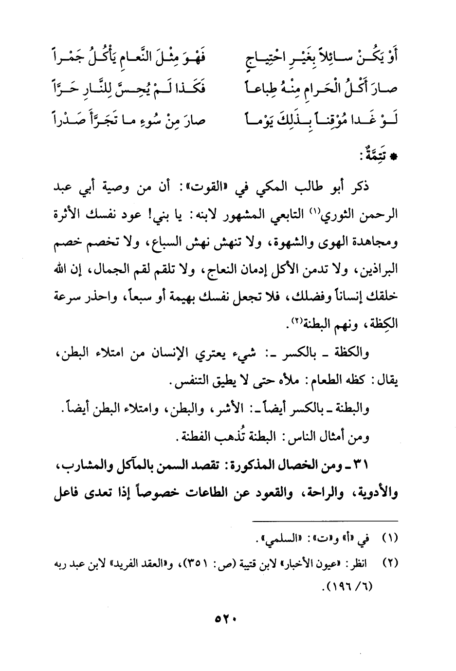 ذكر أبو طالب المكي في "القوت": أن من وصية أبي عبد الرحمن الثوري (¬1) التابعي المشهور لابنه: يا بني! عود نفسك الأثرة ومجاهدة الهوى والشهوة، ولا تنهش نهش السباع، ولا تخصم خصم البراذين، ولا تدمن الأكل إدمان النعاج، ولا تلقم لقم الجمال، إن الله خلقك إنساناً وفضلك، فلا تجعل نفسك بهيمة أو سبعاً، واحذر سرعة الكِظة، ونهم البطنة (¬2).