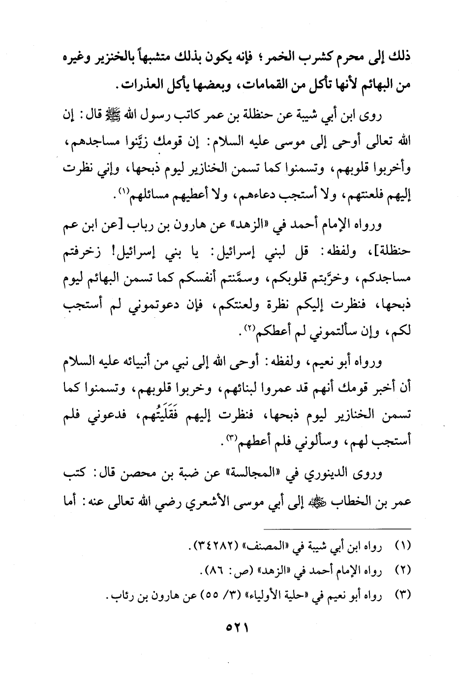 روى ابن أبي شيبة عن حنظلة بن عمر كاتب رسول الله - صلى الله عليه وسلم - قال: إن الله تعالى أوحى إلى موسى عليه السلام: إن قومك زيَّنوا مساجدهم، وأخربوا قلوبهم، وتسمنوا كما تسمن الخنازير ليوم ذبحها، وإني نظرت إليهم فلعنتهم، ولا أستجب دعاءهم، ولا أعطيهم مسائلهم (¬1).