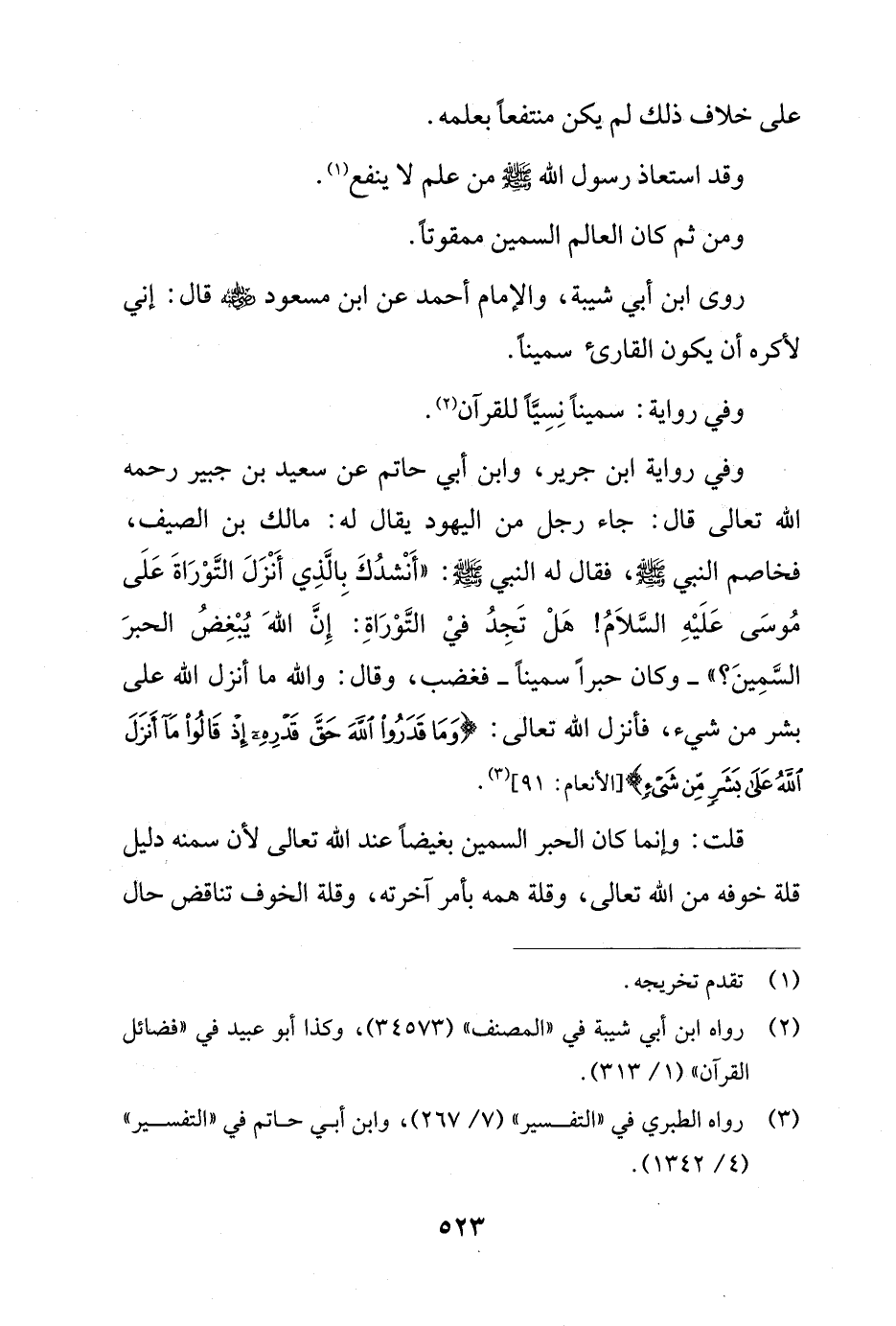وفي رواية ابن جرير، وابن أبي حاتم عن سعيد بن جبير رحمه الله تعالى قال: جاء رجل من اليهود يقال له: مالك بن الصيف، فخاصم النبي - صلى الله عليه وسلم -، فقال له النبي - صلى الله عليه وسلم -: "أَنْشدُكَ بِالَّذِي أَنْزَلَ التَّوْرَاةَ عَلَى مُوسَى عَلَيْهِ السَّلاَمُ! هَلْ تَجِدُ فيْ التَّوْرَاةِ: إِنَّ اللهَ يُبْغِضُ الحبرَ السَّمِينَ؟ " - وكان حبراً سميناً - فغضب، وقال: والله ما أنزل الله على بشر من شيء، فأنزل الله تعالى: {وَمَا قَدَرُوا اللَّهَ حَقَّ قَدْرِهِ إِذْ قَالُوا مَا أَنْزَلَ اللَّهُ عَلَى بَشَرٍ مِنْ شَيْءٍ} [الأنعام: 91] (¬3).