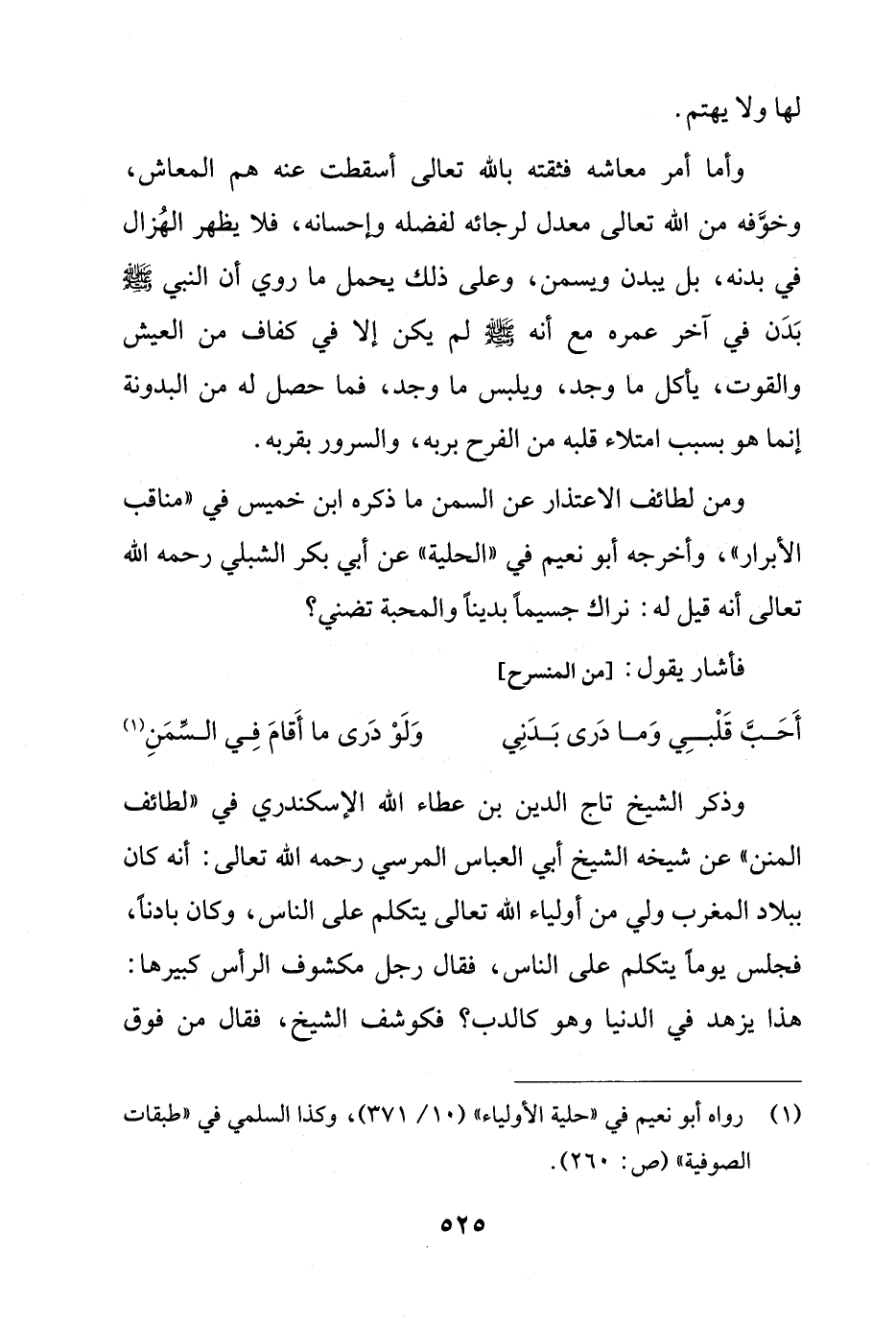 ومن لطائف الاعتذار عن السمن ما ذكره ابن خميس في "مناقب الأبرار"، وأخرجه أبو نعيم في "الحلية" عن أبي بكر الشبلي رحمه الله تعالى أنه قيل له: نراك جسيماً بديناً والمحبة تضني؟