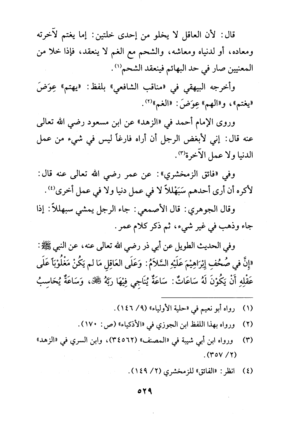 وفي الحديث الطويل عن أبي ذر رضي الله تعالى عنه، عن النبي - صلى الله عليه وسلم -: "إِنَّ في صُحُفِ إِبْرَاهِيْمَ عَلَيْهِ السَّلاَمُ: وَعَلَى العَاقِلِ مَا لم يَكُنْ مَغْلُوْبًا عَلَى عَقْلِهِ أَنْ يَكُوْنَ لَهُ سَاعَات: سَاعَةٌ يُنَاجِي فِيْهَا رَبَّهُ عز وجل، وَسَاعَةٌ يُحَاسِبُ