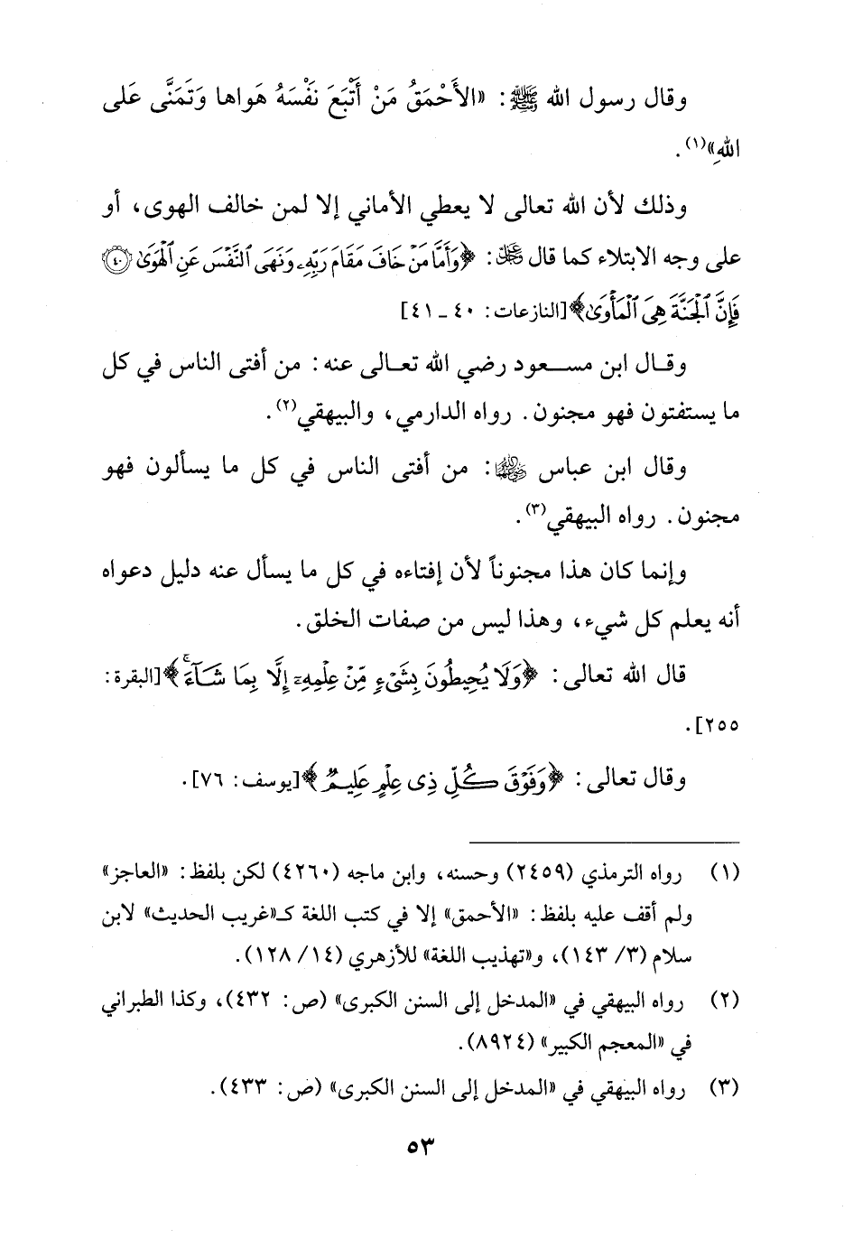 وقال ابن عباس - رضي الله عنه -: من أفتى الناس في كل ما يسألون فهو مجنون. رواه البيهقي (¬3).