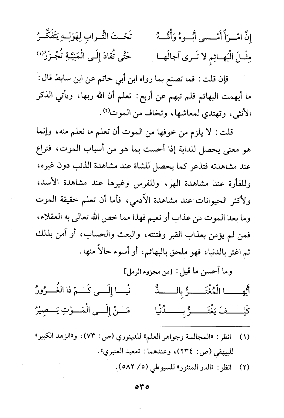 مِثْلَ الْبَهائِمِ لا تَرى آجالَها ... حَتَّى تُقادَ إِلَى الْمَنِيَّةِ تُجْزَرُ (¬1)