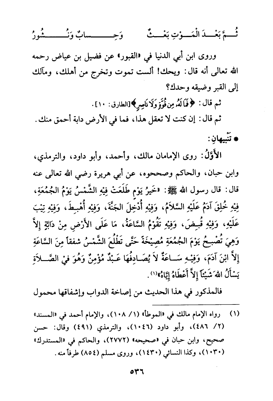 الأَوَّلُ: روى الإمامان مالك، وأحمد، وأبو داود، والترمذي، وابن حبان، والحاكم وصححوه، عن أبي هريرة رضي الله تعالى عنه قال: قال رسول الله - صلى الله عليه وسلم -: "خَيرُ يَوْمِ طَلَعَتْ فِيْهِ الشَّمْسُ يَوْمُ الجُمُعَةِ، فِيْهِ خُلِقَ آدَمُ عَلَيْهِ السَّلاَمُ، وَفِيْهِ أُدْخِلَ الجَنَّةَ، وَفِيْهِ أُهْبِطَ، وَفِيْهِ تِيْبَ عَلَيْهِ، وَفِيْهِ قُبِضَ، وَفِيْهِ تَقُوْمُ السَّاعَةُ، مَا عَلَى الأَرْضِ مِنْ دَابَّةٍ إِلاَّ وَهِيَ تُصْبِحُ يَوْمَ الجُمُعَةِ مُصِيْخَةً حَتَّى تَطْلُعَ الشَّمْسُ شفقاً مِنَ السَّاعَةِ إِلاَّ ابْنَ آدَمَ، وَفِيْهِ سَاعَةٌ لاَ يُصَادِفُهَا عَبْدٌ مُؤْمِنٌ وَهُوَ فيْ الصَّلاَةِ يَسْأَلُ اللهَ شَيْئاً إِلاَّ أَعْطَاهُ إِيَّاهُ" (¬1).