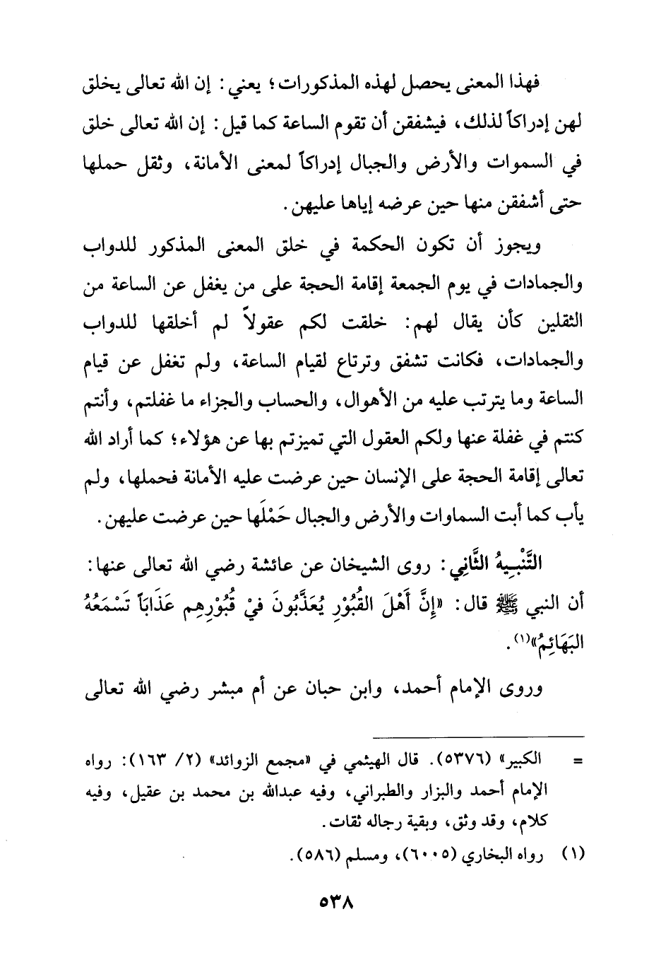 التَّنْبِيهُ الثانِي: روى الشيخان عن عائشة رضي الله تعالى عنها: أن النبي - صلى الله عليه وسلم - قال: "إِنَّ أَهْلَ القُبُوْرِ يُعَذَّبُونَ فيْ قُبُوْرِهِم عَذَابًا تَسْمَعُهُ البَهَائِمُ" (¬1).