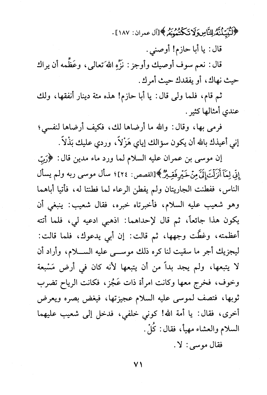 إن موسى بن عمران عليه السلام لما ورد ماء مدين قال: {رَبِّ إِنِّي لِمَا أَنْزَلْتَ إِلَيَّ مِنْ خَيْرٍ فَقِيرٌ} [القصص: 24]؛ سأل موسى ربه ولم يسأل الناس، ففطنت الجاريتان ولم يفطن الرعاء لما فطنتا له، فأتيا أباهما وهو شعيب عليه السلام، فأخبرتاه خبره، فقال شعيب: ينبغي أن يكون هذا جائعاً، ثم قال لإحداهما: اذهبي ادعيه لي، فلما أتته أعظمته، وغطَّت وجهها، ثم قالت: إن أبي يدعوك، فلما قالت: ليجزيك أجر ما سقيت لنا كره ذلك موسى عليه السلام، وأراد أن لا يتبعها، ولم يجد بداً من أن يتبعها لأنه كان في أرض مَسْبعة وخوف، فخرج معها وكانت امرأة ذات عَجُز، فكانت الرياح تضرب ثوبها، فتصف لموسى عليه السلام عجيزتها، فيغض بصره ويعرض أخرى، فقال: يا أمة الله! كوني خلفي، فدخل إلى شعيب عليهما السلام والعشاء مهيأ، فقال: كُلْ.