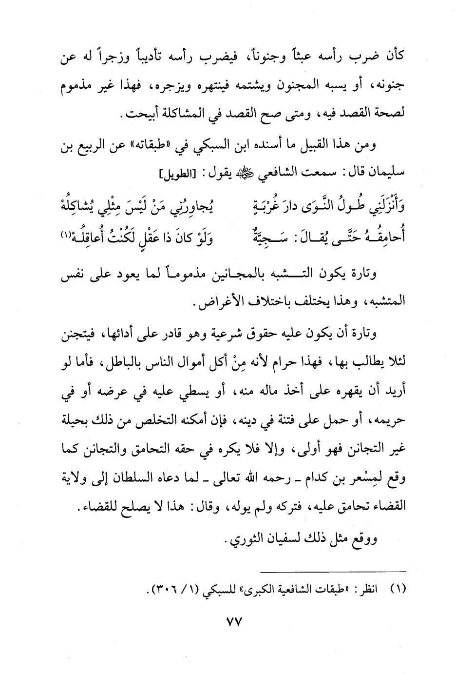 وتارة أن يكون عليه حقوق شرعية وهو قادر على أدائها، فيتجنن لئلا يطالب بها، فهذا حرام لأنه مِنْ أكل أموال الناس بالباطل، فأما لو أريد أن يقهره على أخذ ماله منه، أو يسطي عليه في عرضه أو في حريمه، أو حمل على فتنة في دينه، فإن أمكنه التخلص من ذلك بحيلة غير التجانن فهو أولى، وإلا فلا يكره في حقه التحامق والتجانن كما وقع لمِسْعر بن كدام - رحمه الله تعالى - لما دعاه السلطان إلى ولاية القضاء تحامق عليه، فتركه ولم يوله، وقال: هذا لا يصلح للقضاء.
