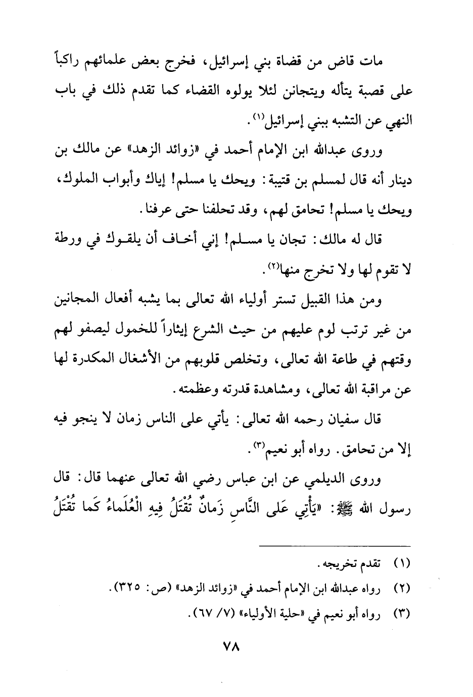 وروى عبد الله ابن الإمام أحمد في "زوائد الزهد" عن مالك بن دينار أنه قال لمسلم بن قتيبة: ويحك يا مسلم! إياك وأبواب الملوك، ويحك يا مسلم! تحامق لهم، وقد تحلفنا حتى عرفنا.