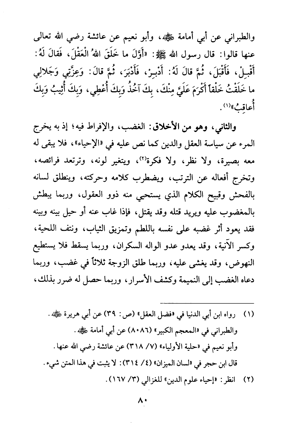 والطبراني عن أبي أمامة - رضي الله عنه -، وأبو نعيم عن عائشة رضي الله تعالى عنها قالوا: قال رسول الله - صلى الله عليه وسلم -: " أَوَّلَ ما خَلَقَ اللهُ الْعَقْلَ، فَقالَ لَهُ: أَقْبِلْ، فَاَقْبَلَ، ثُمَّ قالَ لَهُ: أَدْبِرْ، فَأَدْبَرَ، ثُمَّ قالَ: وَعِزَّتي وَجَلالِي ما خَلَقْتُ خَلْقًا أَكْرَمَ عَلَيَّ مِنْكَ، بِكَ آخُذُ وَبِكَ أُعْطِي، وَبِكَ أُثِيبُ وَبِكَ أُعاقِبُ" (¬1).