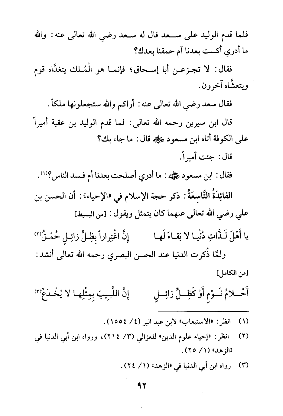 الفائِدَةُ التَّاسِعَةُ: ذكر حجة الإسلام في "الإحياء": أن الحسن بن علي رضي الله تعالى عنهما كان يتمثل ويقول: [من البسيط]