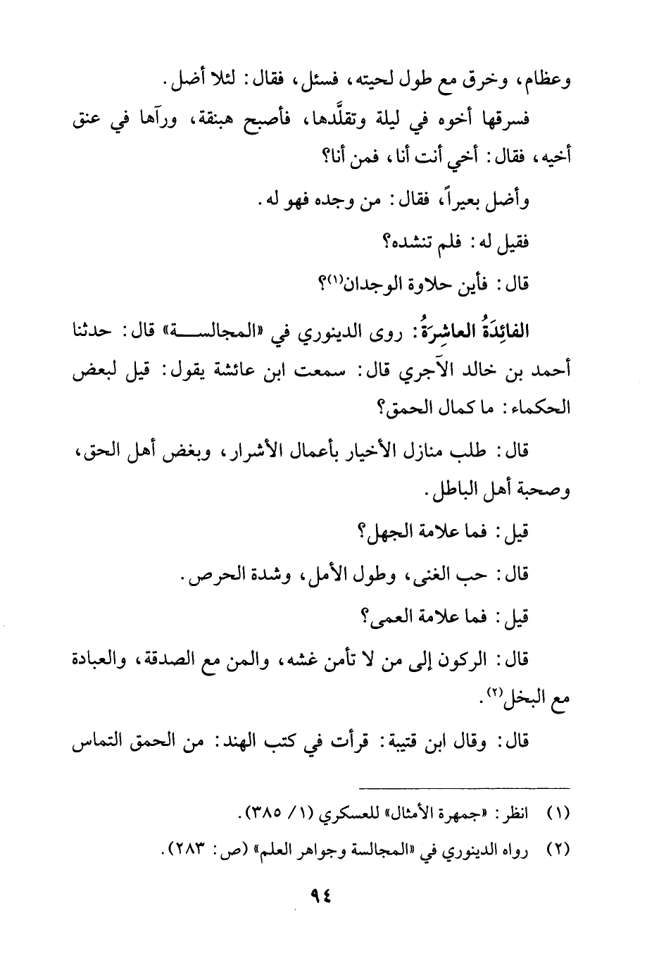 الفائِدَةُ العاشِرَةُ: روى الدينوري في "المجالسة" قال: حدثنا أحمد بن خالد الآجري قال: سمعت ابن عائشة يقول: قيل لبعض الحكماء: ما كمال الحمق؟