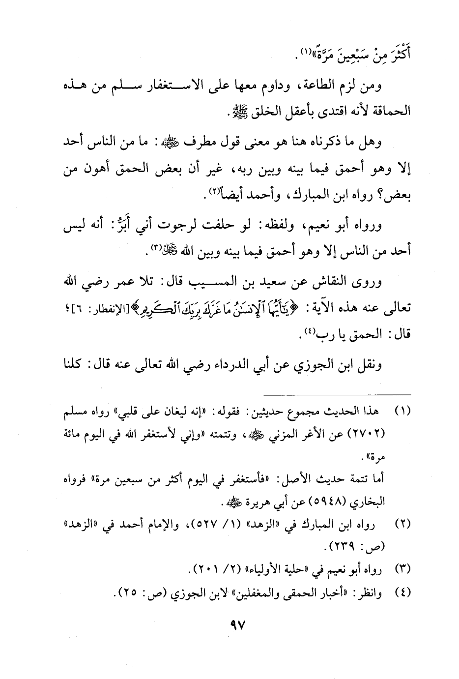 ومن لزم الطاعة، وداوم معها على الاستغفار سلم من هذه الحماقة لأنه اقتدى بأعقل الخلق - صلى الله عليه وسلم -.