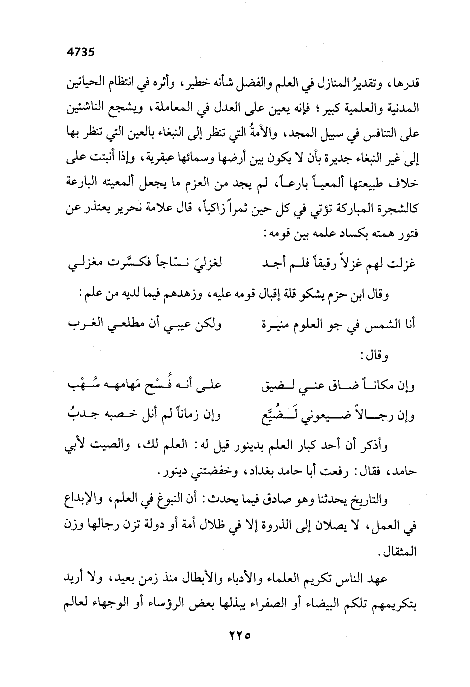 قدرها، وتقديرُ المنازل في العلم والفضل شأنه خطير، وأثره في انتظام الحياتين المدنية والعلمية كبير؛ فإنه يعين على العدل في المعاملة، ويشجع الناشئين على التنافس في سبيل المجد، والأمةُ التي تنظر إلى النبغاء بالعين التي تنظر بها إلى غير النبغاء جديرة بأن لا يكون بين أرضها وسمائها عبقرية، وإذا أنبتت على خلاف طبيعتها ألمعياً بارعاً، لم يجد من العزم ما يجعل ألمعيته البارعة كالشجرة المباركة تؤتي في كل حين تمراً زاكياً، قال علامة نحرير يعتذر عن فتور همته بكساد علمه بين قومه: