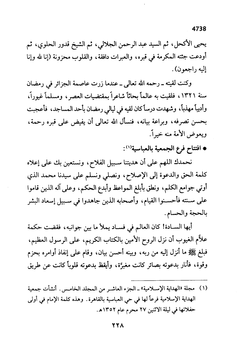 (¬1) مجلة "الهداية الإِسلامية" - الجزء العاشر من المجلد الخامس. أنشأت جمعية الهداية الإِسلامية فرعاً لها في حي العباسية بالقاهرة. وهذه كلمة الإِمام في أولى حفلاتها في ليلة الاثنين 27 محرم عام 1352 هـ.