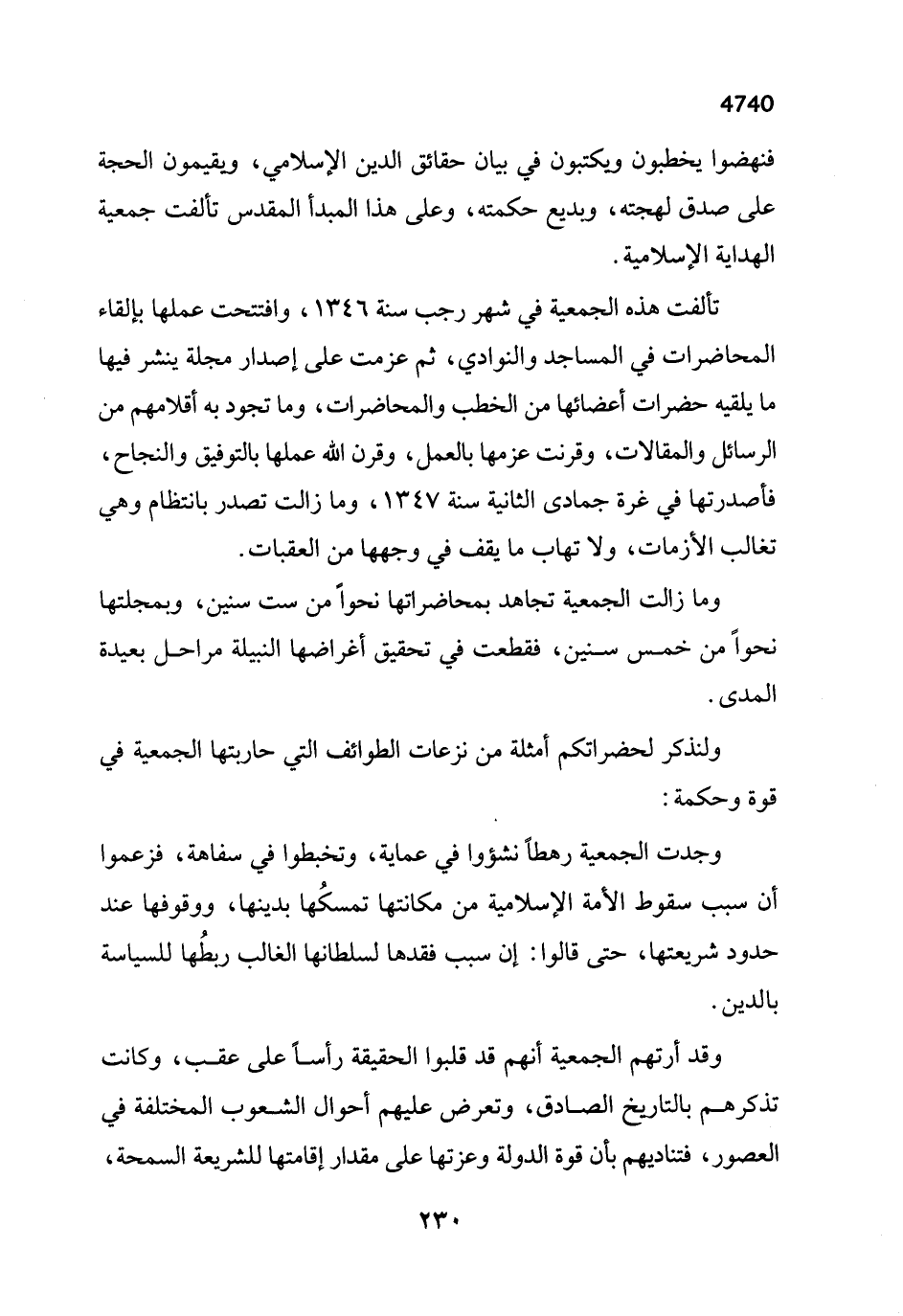 فنهضوا يخطبون ويكتبون في بيان حقائق الدين الإِسلامي، ويقيمون الحجة على صدق لهجته، ويديع حكمته، وعلى هذا المبدأ المقدس تألفت جمعية الهداية الإِسلامية.