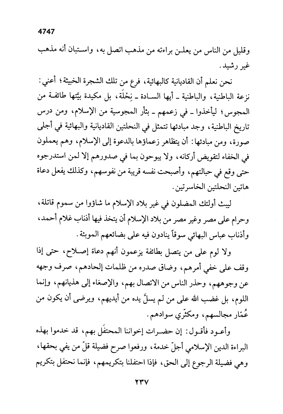 ليبث أولئك المضلون في غير بلاد الإِسلام ما شاؤوا من سموم قاتلة، وحرام على مصر وغير مصر من بلاد الإِسلام أن يتخذ فيها أذناب غلام أحمد، وأذناب عباس البهائي سوقاً ينادون فيه على بضائعهم الموبئة.