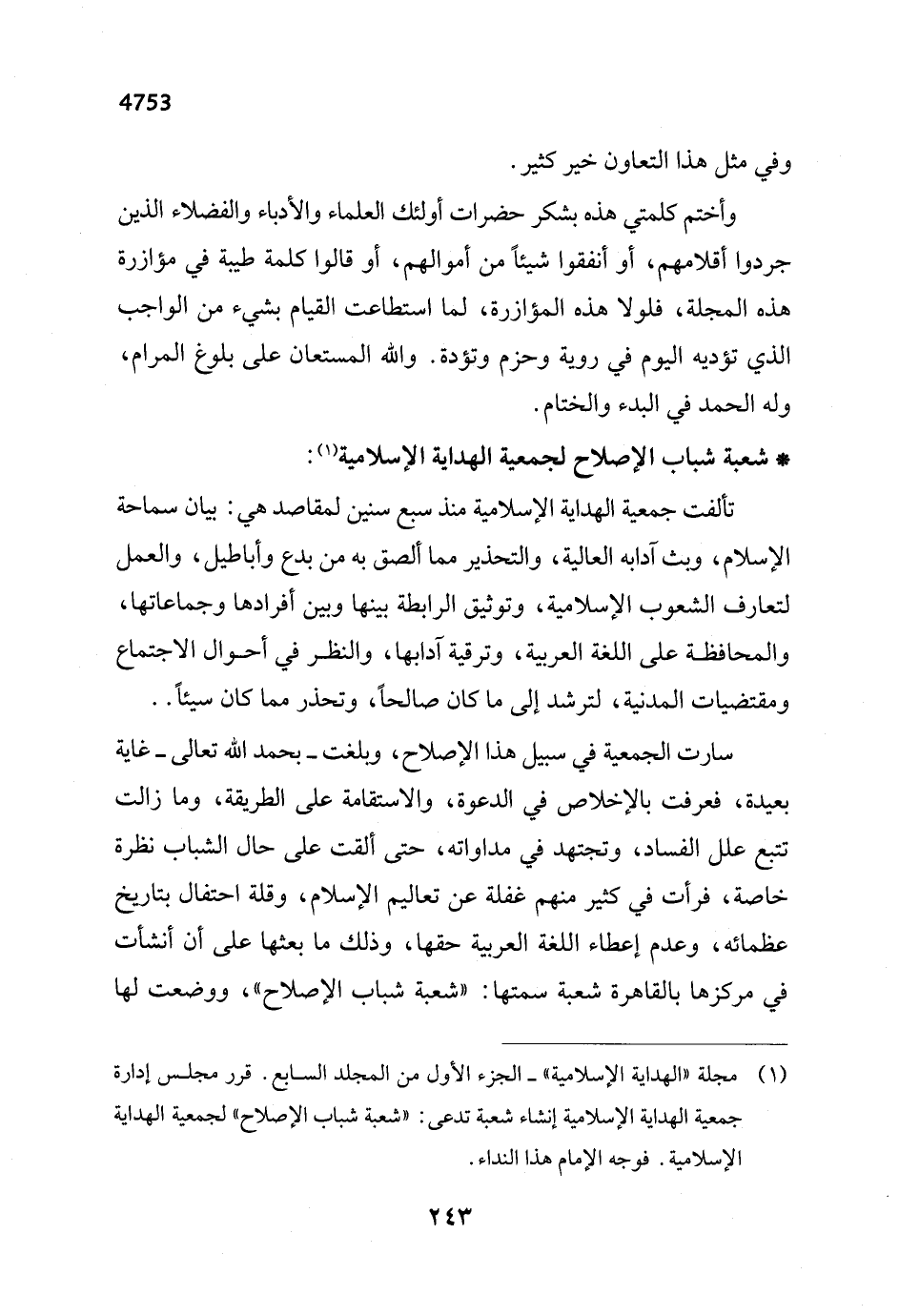 وأختم كلمتي هذه بشكر حضرات أولئك العلماء والأدباء والفضلاء الذين جردوا أقلامهم، أو أنفقوا شيئاً من أموالهم، أو قالوا كلمة طيبة في مؤازرة هذه المجلة، فلولا هذه المؤازرة، لما استطاعت القيام بشيء من الواجب الذي تؤديه اليوم في روية وحزم وتؤدة. والله المستعان على بلوغ المرام، وله الحمد في البدء والختام.