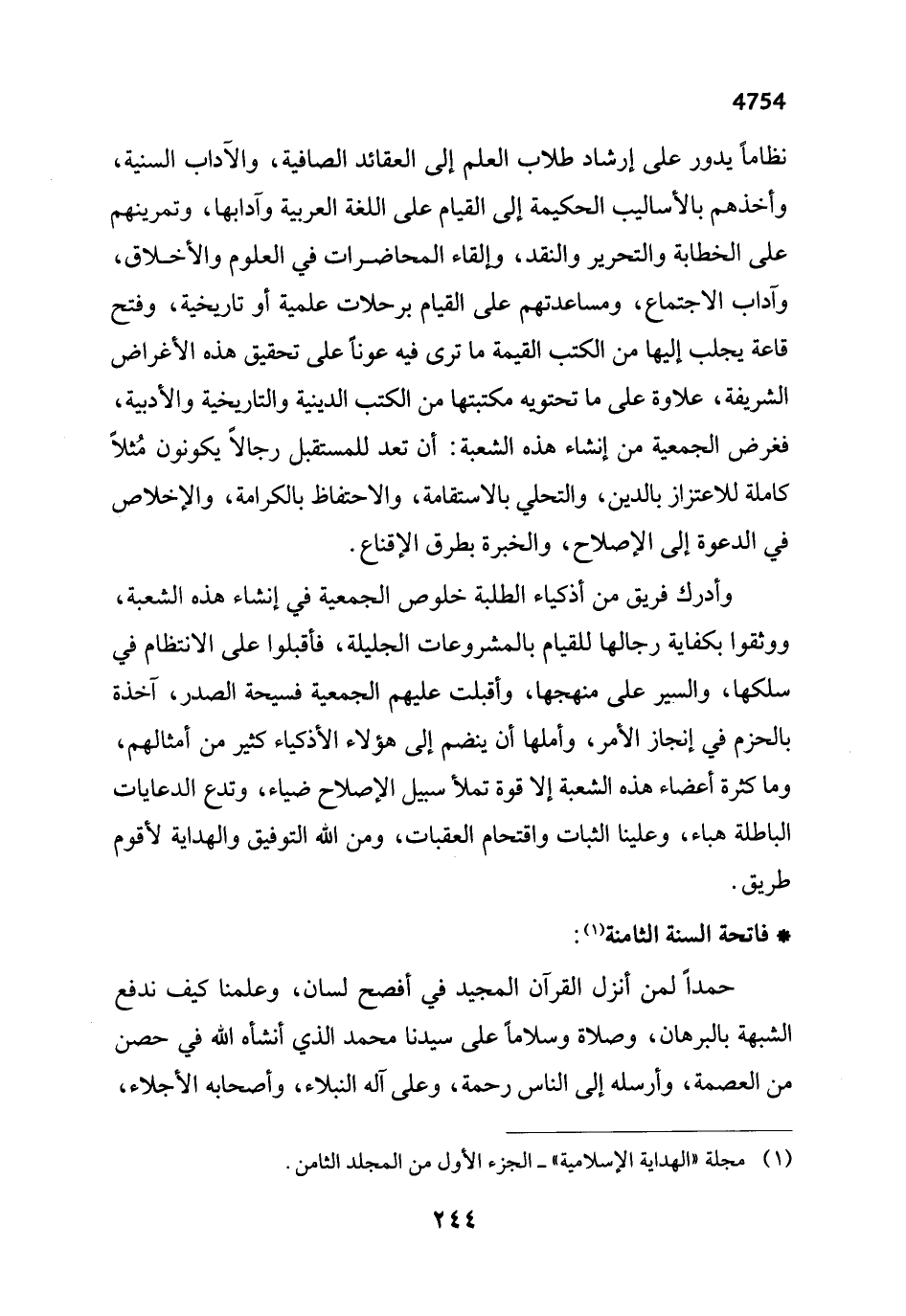 وأدرك فريق من أذكياء الطلبة خلوص الجمعية في إنشاء هذه الشعبة، ووثقوا بكفاية رجالها للقيام بالمشروعات الجليلة، فأقبلوا على الانتظام في سلكها، والسير على منهجها، وأقبلت عليهم الجمعية فسيحة الصدر، آخذة بالحزم في إنجاز الأمر، وأملها أن ينضم إلى هؤلاء الأذكياء كثير من أمثالهم، وما كثرة أعضاء هذه الشعبة إلا قوة تملأ سبيل الإصلاح ضياء، وتدع الدعايات الباطلة هباء، وعلينا الثبات واقتحام العقبات، ومن الله التوفيق والهداية لأقوم طريق.