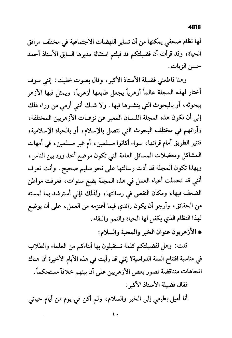 وهنا قاطعني فضيلة الأستاذ الأكبر، وقال بصوت خفيت: إنني سوف أختار لهذه المجلة عالماً أزهرياً يجعل طابعها أزهرياً، ويمثل فيها الأزهر ببحوثه، أو بالبحوث التي ينشرها فيها. ولا شك أنني أرمي من وراء ذلك إلى أن تكون هذه المجلة اللسان المعبر عن نزعات الأزهريين المختلفة، وآرائهم في مختلف البحوث التي تتصل بالإسلام، أو بالحياة الإسلامية، فتنير الطريق أمام قرائها، سواء أكانوا مسلمين، أم غير مسلمين، في أمهات المشاكل ومعضلات المسائل العامة التي تكون موضع أخذ ورد بين الناس، وبهذا تكون المجلة قد أدت رسالتها على نحو سليم صحيح. وأنت تعرف أنني قد تحملت أعباء العمل في هذه المجلة بضع سنوات، فعرفت مواطن الضعف فيها، ومكان النقص في رسالتها، ولذلك فإني أسترشد بما لمسته من الحقائق، وأرجو أن يكون رائدي فيما أعتزمه من العمل، على أن يوضع لهذا النظام الذي يكفل لها الحياة والنمو والبقاء.