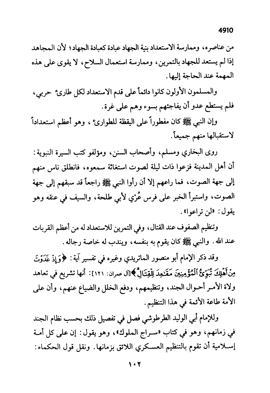 وللإمام أبي الوليد الطرطوشي فصل في تفصيل ذلك بحسب نظام الجند في زمانهم، وهو في كتاب "سراج الملوك" وهو يقول: إن على كل أمة إسلامية أن تقوم بالتنظيم العسكري اللائق بزمانها. ونقل قول الحكماء: