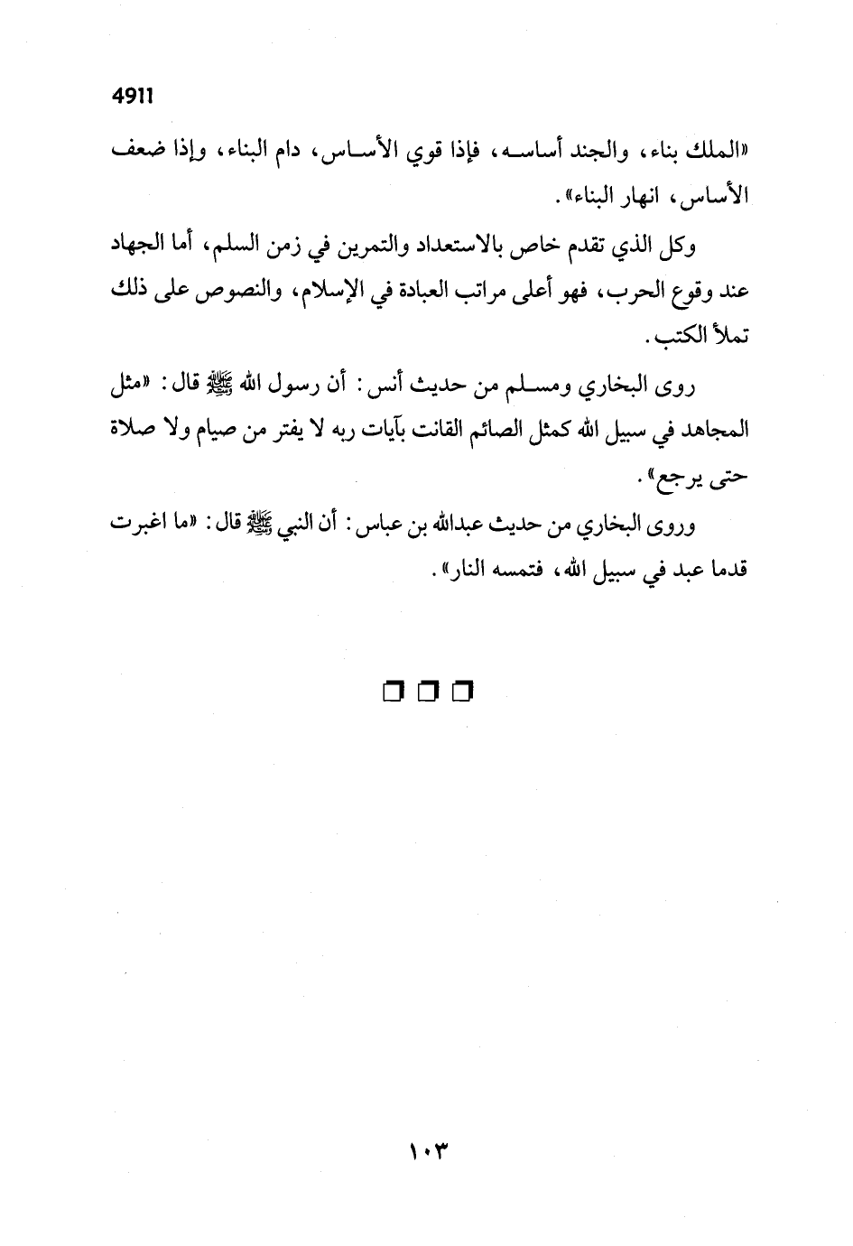 وكل الذي تقدم خاص بالاستعداد والتمرين في زمن السلم، أما الجهاد عند وقوع الحرب، فهو أعلى مراتب العبادة في الإسلام، والنصوص على ذلك تملأ الكتب.
