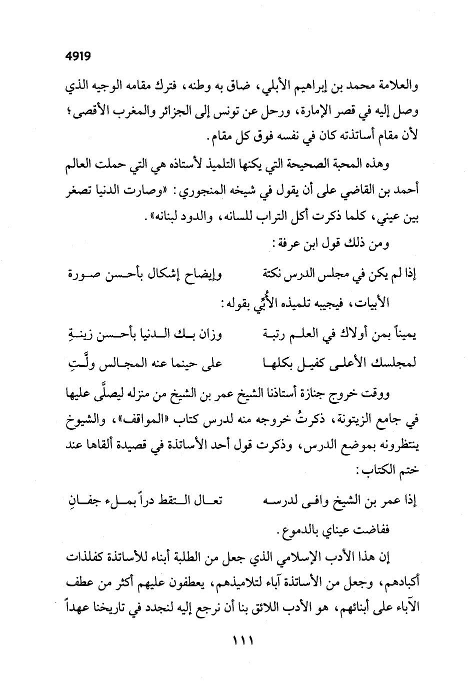 إن هذا الأدب الإسلامي الذي جعل من الطلبة أبناء للأساتذة كفلذات كبادهم، وجعل من الأساتذة آباء لتلاميذهم، يعطفون عليهم أكثر من عطف الآباء على أبنائهم، هو الأدب اللائق بنا أن نرجع إليه لنجدد في تاريخنا عهداً