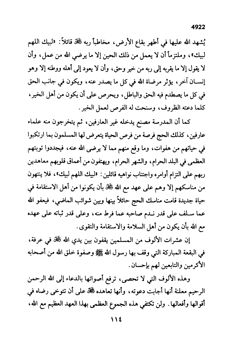 وهذه الألوف التي لا تحصى، ترفع أصواتها بالدعاء إلى الله الرحمن الرحيم معلنة أنها أجابت دعوته، وأنها تعاهده -عَزَّ وَجَلَّ- على أن تتوخى رضاه في أقوالها وأفعالها. ولن تكتفي هذه الجموع العظمى بهذا العهد العظيم مع الله،