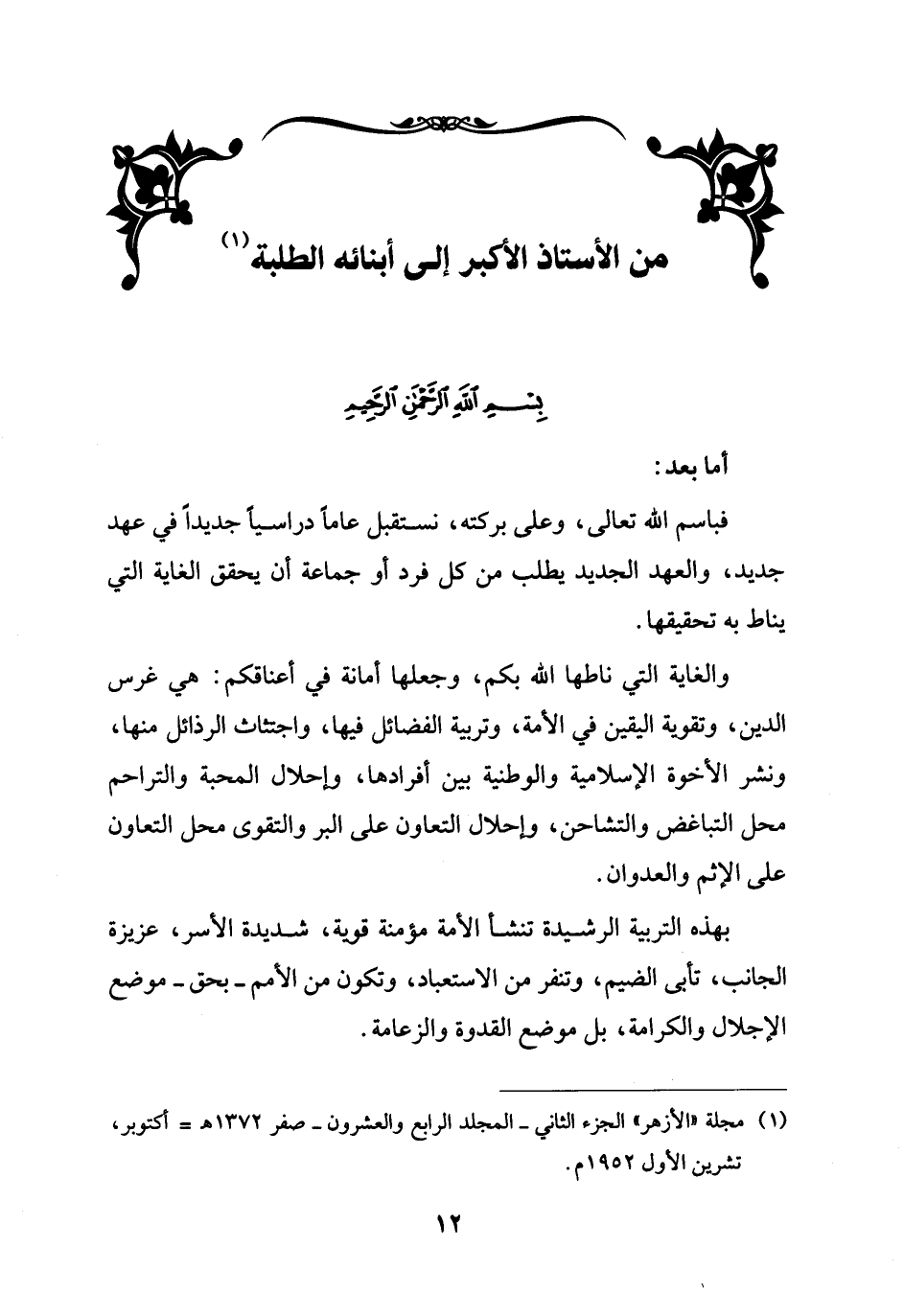 من الأستاذ الأكبر إلى أبنائه الطلبة (¬1)