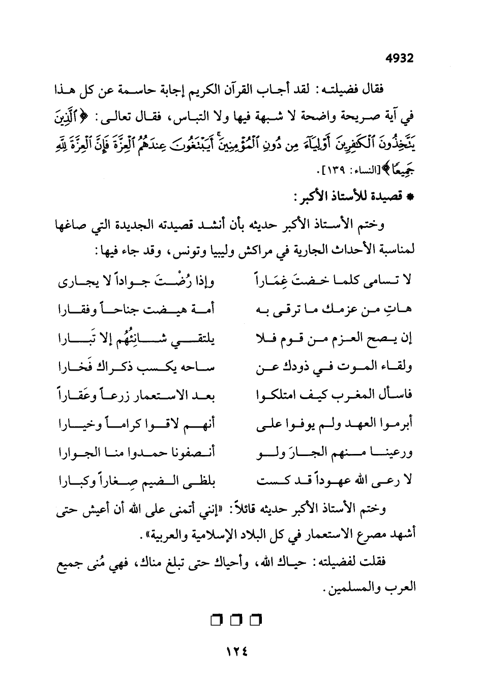 وختم الأستاذ الأكبر حديثه بأن أنشد قصيدته الجديدة التي صاغها لمناسبة الأحداث الجارية في مراكش وليبيا وتونس، وقد جاء فيها: