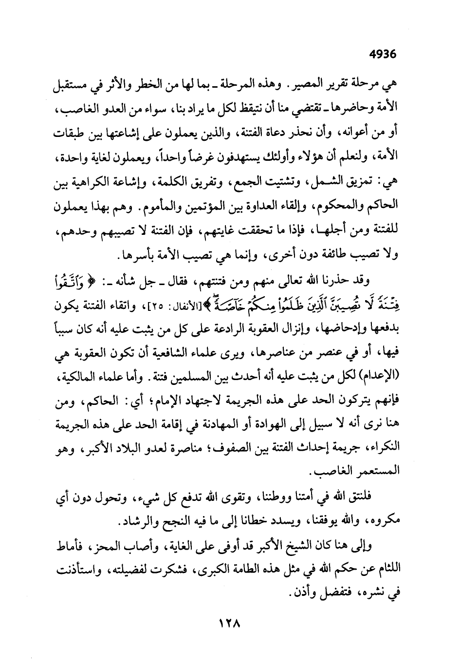 هي مرحلة تقرير المصير. وهذه المرحلة -بما لها من الخطر والأثر في مستقبل الأمة وحاضرها- تقتضي منا أن نتيقظ لكل ما يراد بنا، سواء من العدو الغاصب، أو من أعوانه، وأن نحذر دعاة الفتنة، والذين يعملون على إشاعتها بين طبقات الأمة، ولنعلم أن هؤلاء وأولئك يستهدفون غرضاً واحداً، ويعملون لغاية واحدة، هي: تمزيق الشمل، وتشتيت الجمع، وتفريق الكلمة، وإشاعة الكراهية بين الحاكم والمحكوم، وإلقاء العداوة بين المؤتمين والمأموم. وهم بهذا يعملون للفتنة ومن أجلها، فإذا ما تحققت غايتهم، فإن الفتنة لا تصيبهم وحدهم، ولا تصيب طائفة دون أخرى، وإنما هي تصيب الأمة بأسرها.