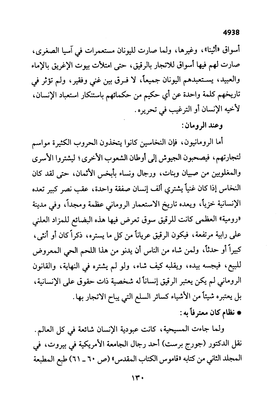 أسواق "أثينا"، وغيرها، ولما صارت لليونان مستعمرات في آسيا الصغرى، صارت لهم فيها أسواق للاتجار بالرقيق، حتى امتلأت بيوت الإغريق بالإماء والعبيد، يستعبدهم اليونان جميعا، لا فرق بين غني وفقير، ولم تؤثر في تاريخهم كلمة واحدة عن أي حكيم من حكمائهم باستنكار استعباد الإنسان، لأخيه الإنسان أو الترغيب في تحريره.