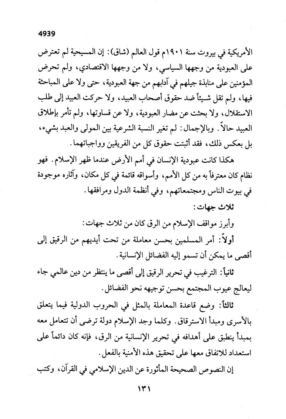 الأمريكية في بيروت سنّة 1901 م قول العالم (شاق): إن المسيحية لم تعترض على العبودية من وجهها السياسي، ولا من وجهها الاقتصادي، ولم تحرض المؤمنين على منابذة جيلهم في آدابهم من جهة العبودية، حتى ولا على المباحثة فيها، ولم تقل شيئاً ضد حقوق أصحاب العبيد، ولا حركت العبيد إلى طلب الاستقلال، ولا بحثت عن مضار العبودية، ولا عن قساوتها، ولم تأمر باطلاق العبيد حالاً. وبالإجمال: لم تغير النسبة الشرعية بين المولى والعبد بشيء، بل بعكس ذلك، فقد أثبتت حقوق كل من الفريقين وواجباتهما.