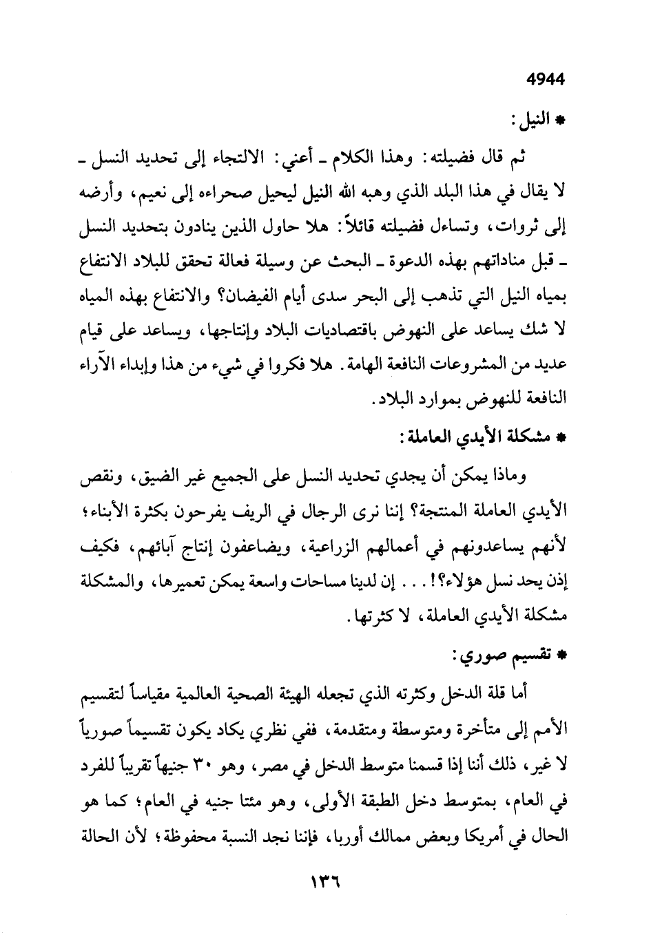 وماذا يمكن أن يجدي تحديد النسل على الجميع غير الضيق، ونقص الأيدي العاملة المنتجة؟ إننا نرى الرجال في الريف يفرحون بكثرة الأبناء؛ لأنهم يساعدونهم في أعمالهم الزراعية، ويضاعفون إنتاج آبائهم، فكيف إذن يحد نسل هؤلاء؟ ... إن لدينا مساحات واسعة يمكن تعميرها، والمشكلة مشكلة الأيدي العاملة، لا كثرتها.