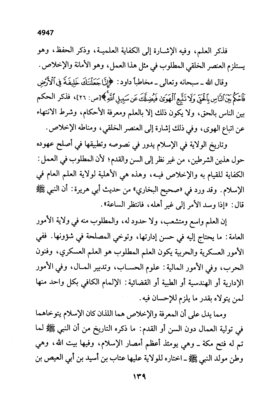 وتاريخ الولاية في الإسلام يدور في نصوصه وتطبيقها في أصلح عهوده حول هذين الشرطين، من غير نظر إلى السن والقدم؛ لأن المطلوب في العمل: الكفاية للقيام به والإخلاص فيه، وهذه هي الأهلية لولاية العلم العام في الإسلام. وقد ورد في "صحيح البخاري" من حديث أبي هريرة: أن النبي - صلى الله عليه وسلم - قال: "إذا وسد الأمر إلى غير أهله، فانتظر الساعة".