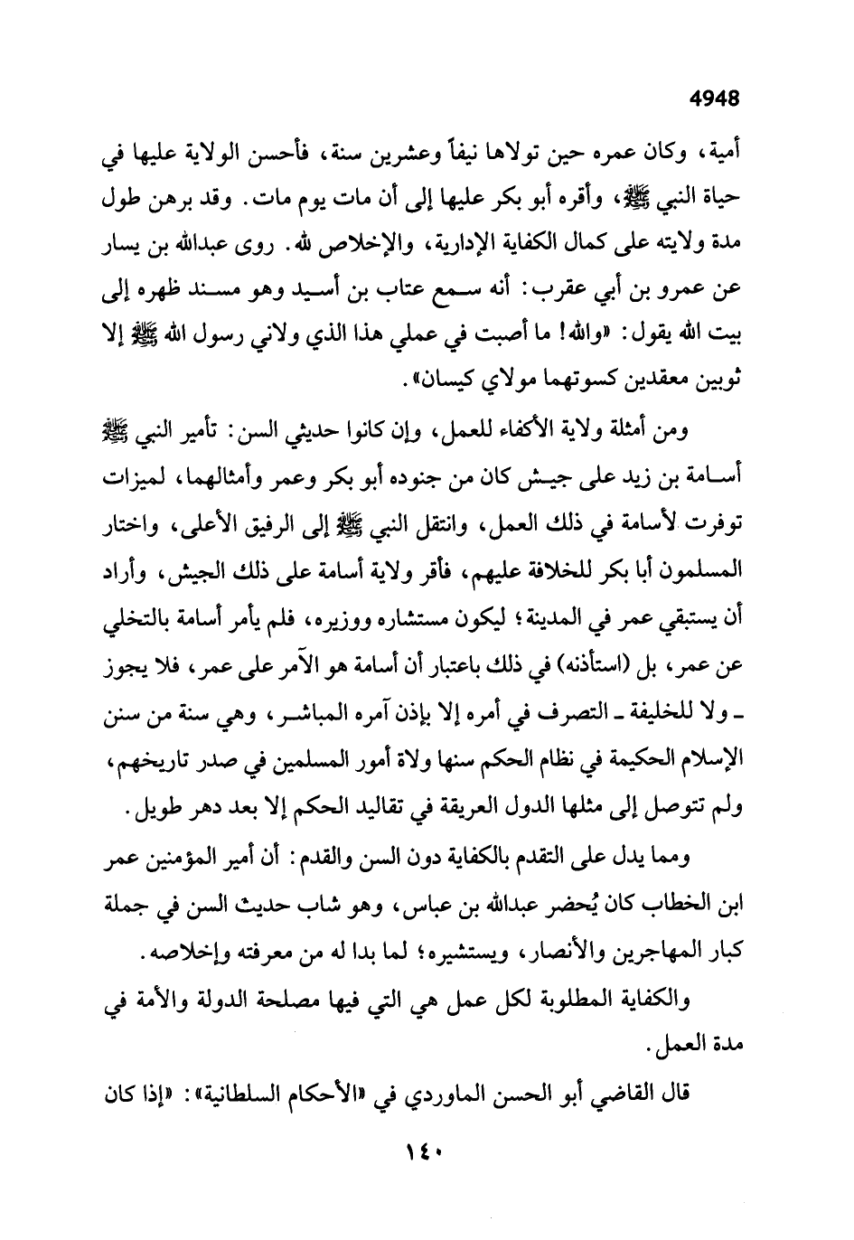 ومن أمثلة ولاية اكفاء للعمل، وإن كانوا حديثي السن: تأمير النبي - صلى الله عليه وسلم - أسامة بن زيد على جيش كان من جنوده أبو بكر وعمر وأمثالهما، لميزات توفرت لأسامة في ذلك العمل، وانتقل النبي - صلى الله عليه وسلم - إلى الرفيق الأعلى، واختار المسلمون أبا بكر للخلافة عليهم، فأقر ولاية أسامة على ذلك الجيش، وأراد أن يستبقي عمر في المدينة؛ ليكون مستشاره ووزيره، فلم يأمر أسامة بالتخلي عن عمر، بل (استأذنه) في ذلك باعتبار أن أسامة هو الآمر على عمر، فلا يجوز -ولا للخليفة- التصرف في أمره إلابإذن آمره المباشر، وهي سنّة من سنن الإسلام الحكيمة في نظام الحكم سنها ولاة أمور المسلمين في صدر تاريخهم، ولم تتوصل إلى مثلها الدول العريقة في تقاليد الحكم إلا بعد دهر طويل.