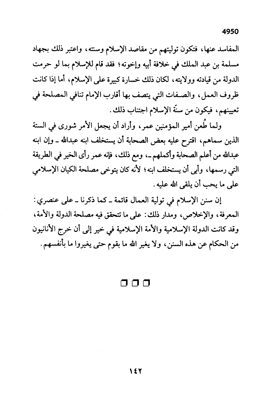 إن سنن الإسلام في تولية العمال قائمة -كما ذكرنا- على عنصري: المعرفة، والإخلاص، ومدار ذلك: على ما تتحقق فيه مصلحة الدولة والأمة، وقد كانت الدولة الإسلامية والأمة الإسلامية في خير إلى أن خرج الأنانيون من الحكام عن هذه السنن، ولا يغير الله ما بقوم حتى يغيروا ما بأنفسهم.