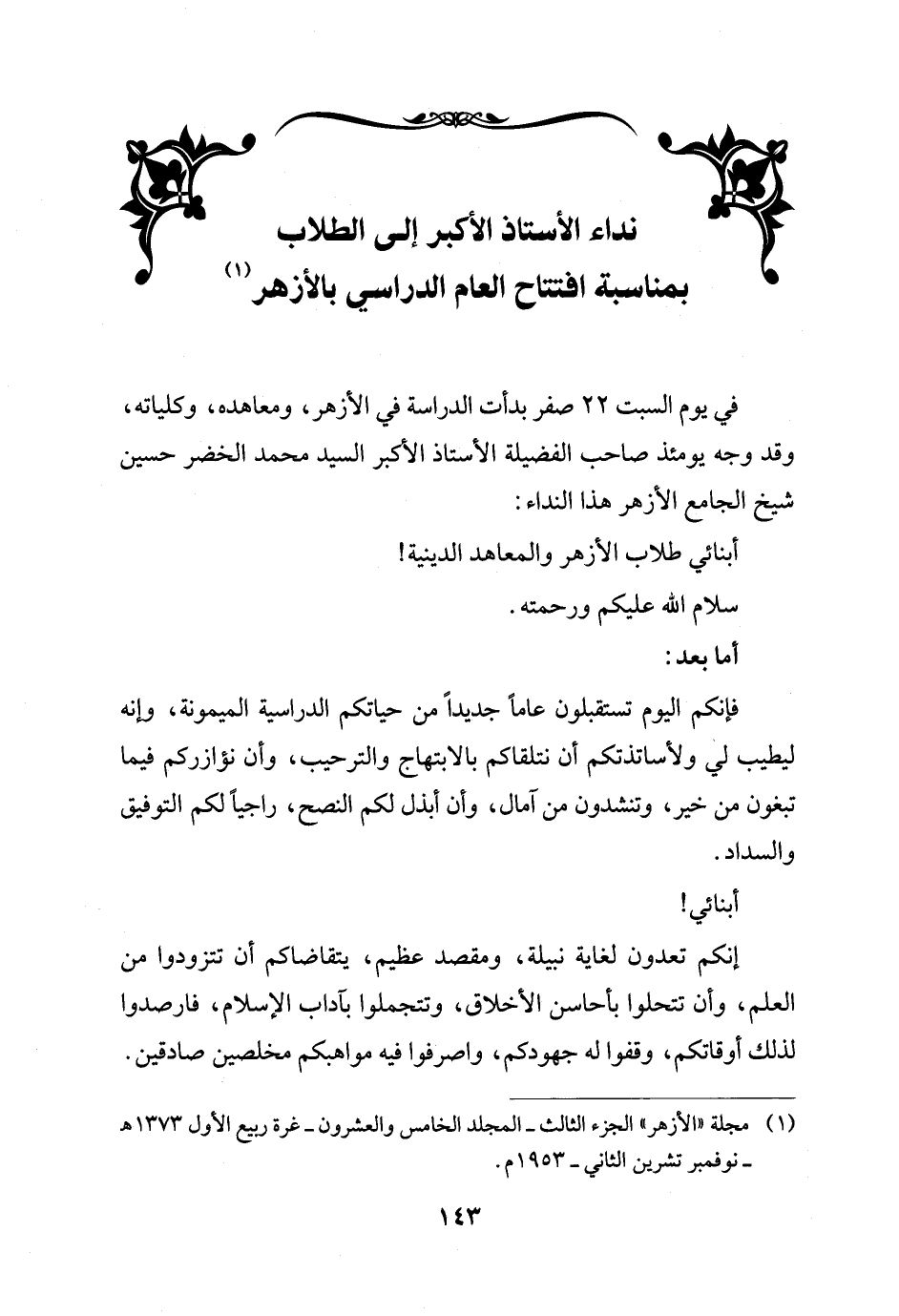 نداء الأستاذ الأكبر إلى الطلاب بمناسبة افتتاح العام الدراسي بالأزهر (¬1)