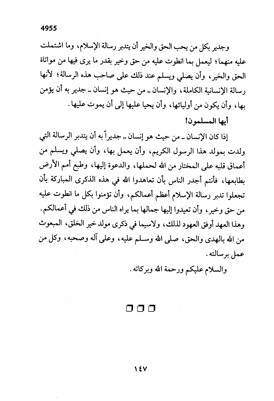 إذا كان الإنسان -من حيث هو إنسان- جديراً به أن يتدبر الرسالة التي ولدت بمولد هذا الرسول الكريم، وأن يعمل بها، وأن يصلي ويسلم من أعماق قلبه على المختار من الله لحملها، والدعوة إليها، وطبع أمم الأرض بطابعها، فأنتم أجدر الناس بأن تعاهدوا الله في هذه الذكرى المباركة بأن تجعلوا تدبر رسالة الإسلام أعظم أعمالكم، وأن تؤمنوا بكل ما انطوت عليه من حق وخير، وأن تعيدوا إليها جمالها بما يراه الناس من ذلك في أعمالكم. وهذا العهد أوفق العهود لذلك، ولاسيما في ذكرى مولد خير الخلق، المبعوث من الله بالهدى والحق، صلى الله وسلم عليه، وعلى آله وصحبه، وكل من عمل برسالته.