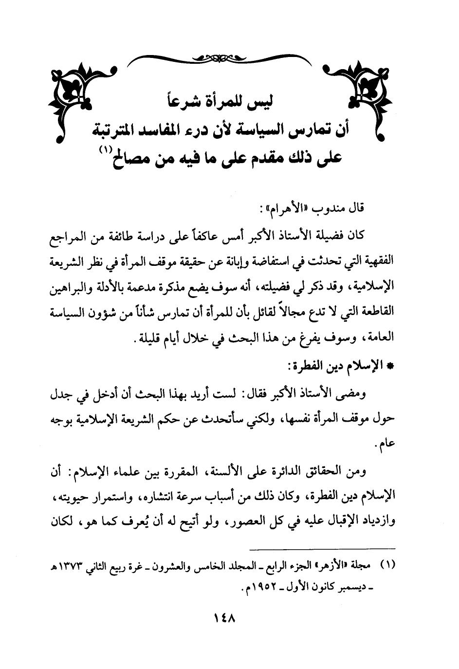 كان فضيلة الأستاذ الأكبر أمس عاكفاً على دراسة طائفة من المراجع الفقهية التي تحدثت في استفاضة وإبانة عن حقيقة موقف المرأة في نظر الشريعة الإسلامية، وقد ذكر لي فضيلته، أنه سوف يضع مذكرة مدعمة بالأدلة والبراهين القاطعة التي لا تدع مجالاً لقائل بأن للمرأة أن تمارس شأناً من شؤون السياسة العامة، وسوف يفرغ من هذا البحث في خلال أيام قليلة.