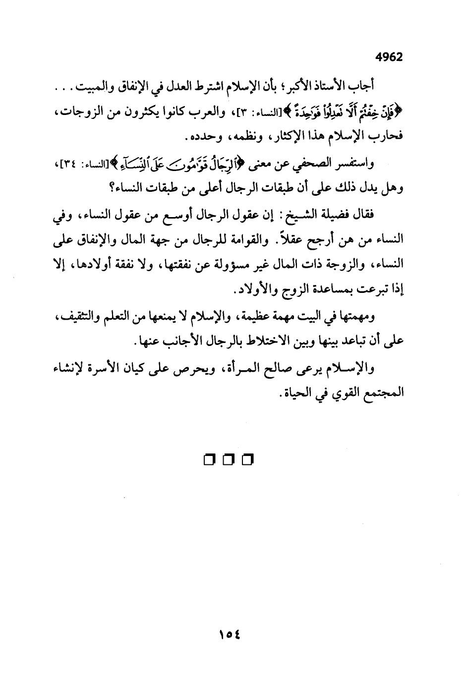 واستفسر الصحفي عن معنى {الرِّجَالُ قَوَّامُونَ عَلَى النِّسَاءِ} [النساء: 34} , وهل يدل ذلك على أن طبقات الرجال أعلى من طبقات النساء؟