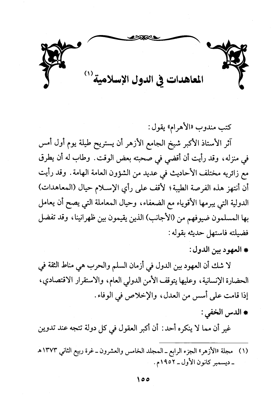 آثر الأستاذ الأكبر شيخ الجامع الأزهر أن يستريح طيلة يوم أول أمس في منزله، وقد رأيت أن أقضي في صحبته بعض الوقت. وطاب له أن يطرق مع زائريه مختلف الأحاديث في عديد من الشؤون العامة الهامة. وقد رأيت أن أنتهز هذه الفرصة الطيبة؛ لأقف على رأي الإسلام حيال (المعاهدات) الدولية التي يبرمها الأقوياء مع الضعفاء، وحيال المعاملة التي يصح أن يعامل بها المسلمون ضيوفهم من (الأجانب) الذين يقيمون بين ظهرانينا، وقد تفضل فضيلته فاستهل حديثه بقوله: